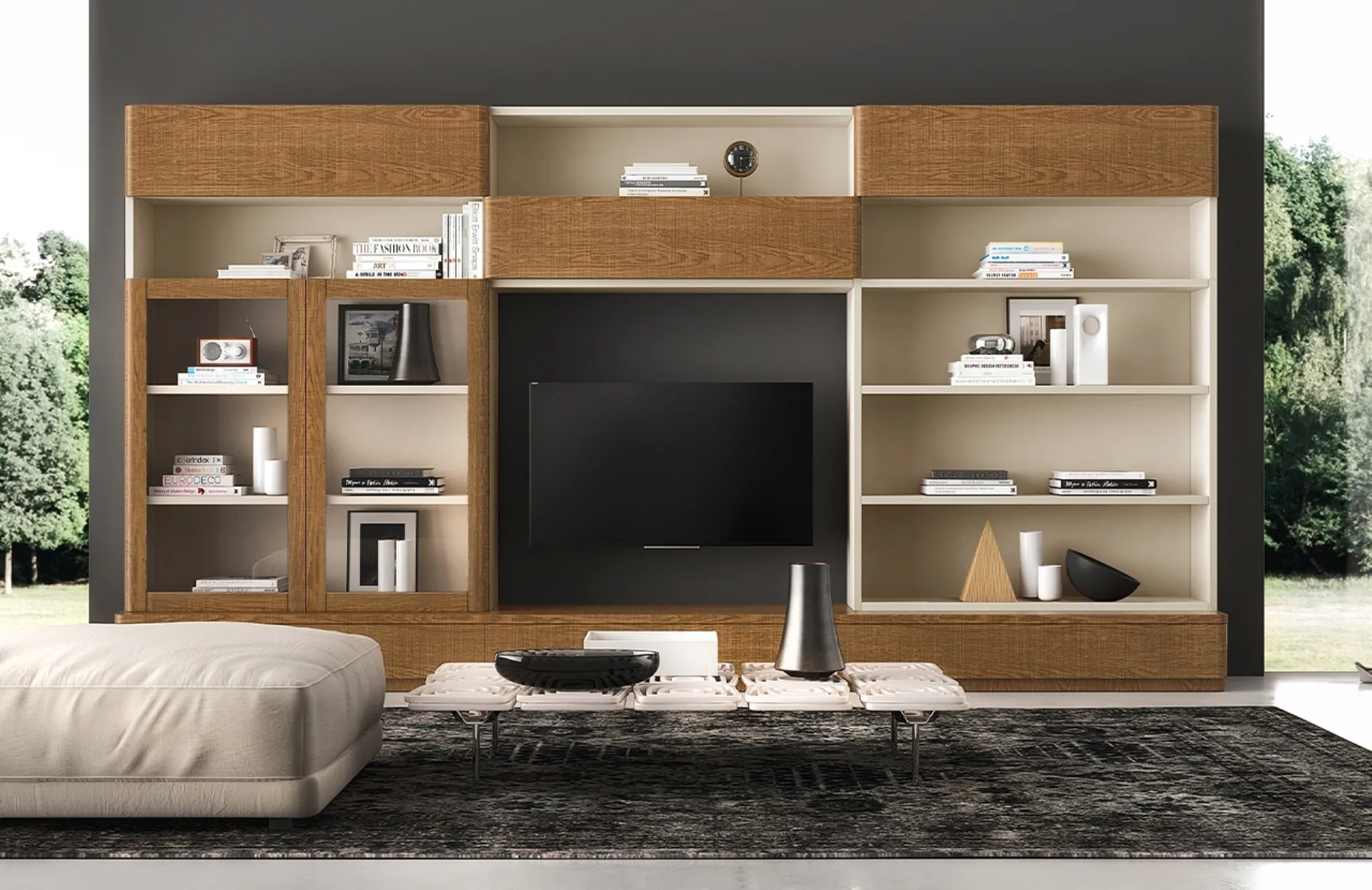 La Parete attrezzata Fiori di Loto composizione 13 di Le Fablier nell'immagine, con finitura in legno, risolve le più particolari problematiche abitative di spazio e stile senza rinunciare alla ricerca estetica. Questa soluzione costituisce tutta la qualità che il brand assicura grazie a pluriennale professionalità e grande dedizione nel settore dell'arredo e del design. Se cerchi arredi salvaspazio e realizzabili su misura, contattaci e scopri di più sull'Arredamento Casa dei migliori produttori. Anche in un soggiorno non generoso, questo tipo di arredo riesce a organizzare al meglio gli spazi valorizzando ogni angolo e garantendo componibilità su misura tipica delle soluzioni moderne.