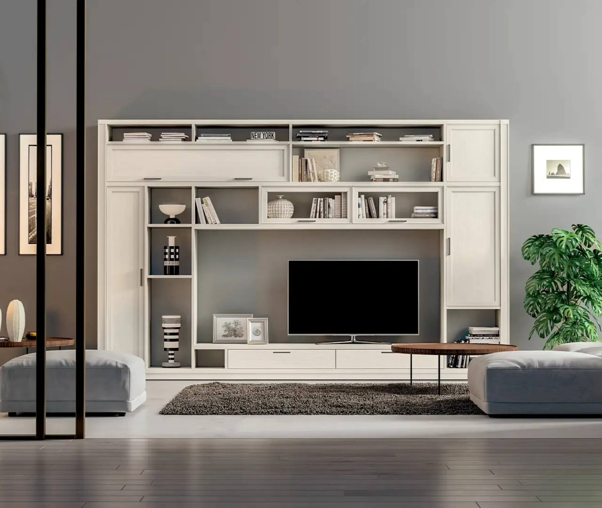 I mobili soggiorno in laccato opaco dalle linee moderne come il modello nella fotografia sono davvero poliedrici e capaci di arredare il soggiorno sfruttando bene ogni angolo. Visto che il living deve essere uno spazio ben organizzato e di grande valore estetico, sono molto utili alcuni arredi belli e pratici come le Pareti Attrezzate. La Parete Attrezzata Melograno composizione 97 di Le Fablier nella fotografia è una delle più originali soluzioni d’arredo in commercio: l'alta componibilità e le varie opportunità di progettazione la rendono funzionale ed esteticamente gradevole. Lasciati stuzzicare da un ricco catalogo di arredi per la zona giorno e potrai trovare la parete attrezzata che fa al caso tuo.