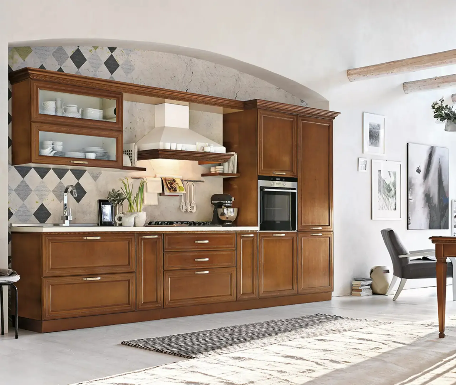 La Cucina Classica lineare I Ciliegi composizione 01 di Le Fablier nell'immagine presenta un design assai funzionale, elegante e sofisticato, portavoce del tipico aspetto suggestivo delle Cucine Classiche. Scopri nel nostro showroom un ricco catalogo di soluzioni della marca: la collezione completa Le Fablier ti attende! Solo con le più esclusive soluzioni in linea potrai arredare l'ambiente secondo le tue personali esigenze abitative ma in perfetto stile tradizionale.